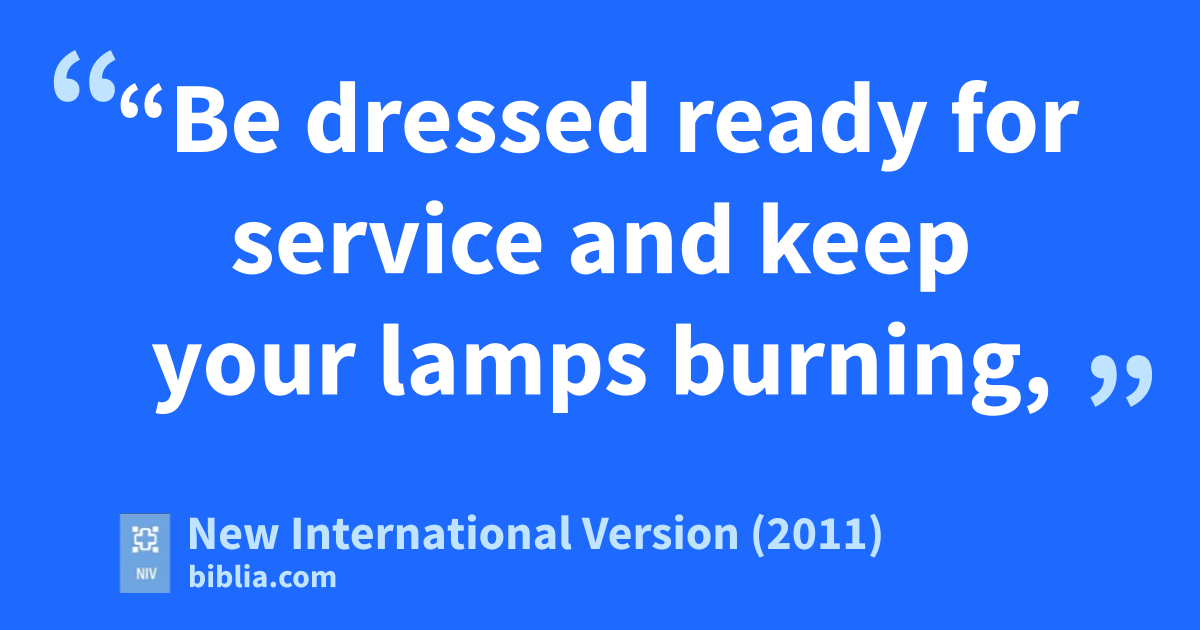 35 “Be dressed ready for service and keep your lamps burning, 36 like servants waiting for their master to return from a wedding banquet, so that when he comes and knocks they can immediately open the door for him. 37 It will be good for those servants whose master finds them watching when he comes.c Truly I tell you, he will dress himself to serve, will have them recline at the table and will come and wait on them.d 38 It will be good for those servants whose master finds them ready, even if he comes in the middle of the night or toward daybreak. 39 But understand this: If the owner of the house had known at what hour the thiefe was coming, he would not have let his house be broken into. 40 You also must be ready,f because the Son of Man will come at an hour when you do not expect him.”