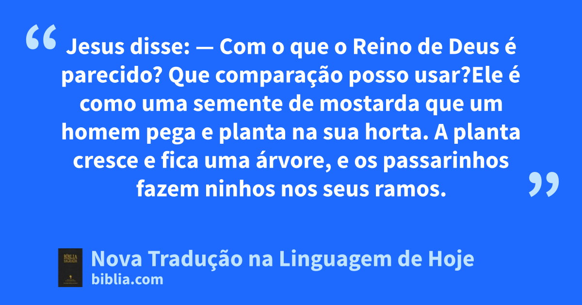 — Com o que o * Reino de Deus é parecido? Que comparação posso usar?19 Ele é como uma semente de mostarda que um homem pega e planta na sua horta. A planta cresce e fica uma árvore, e os passarinhos fazem ninhos nos seus ramos.