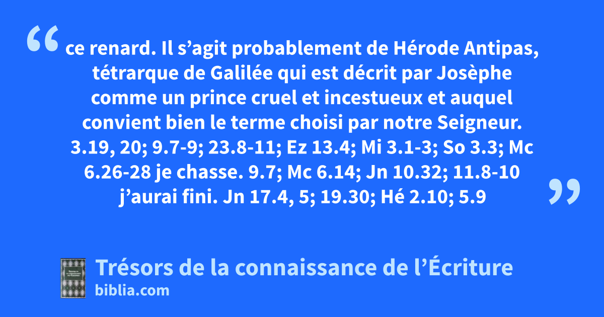 ce renard. Il s’agit probablement de Hérode Antipas, tétrarque de Galilée qui est décrit par Josèphe comme un prince cruel et incestueux et auquel convient bien le terme choisi par notre Seigneur. 3.19, 20; 9.7-9; 23.8-11; Ez 13.4; Mi 3.1-3; So 3.3; Mc 6.26-28 je chasse. 9.7; Mc 6.14; Jn 10.32; 11.8-10 j’aurai fini. Jn 17.4, 5; 19.30; Hé 2.10; 5.9
