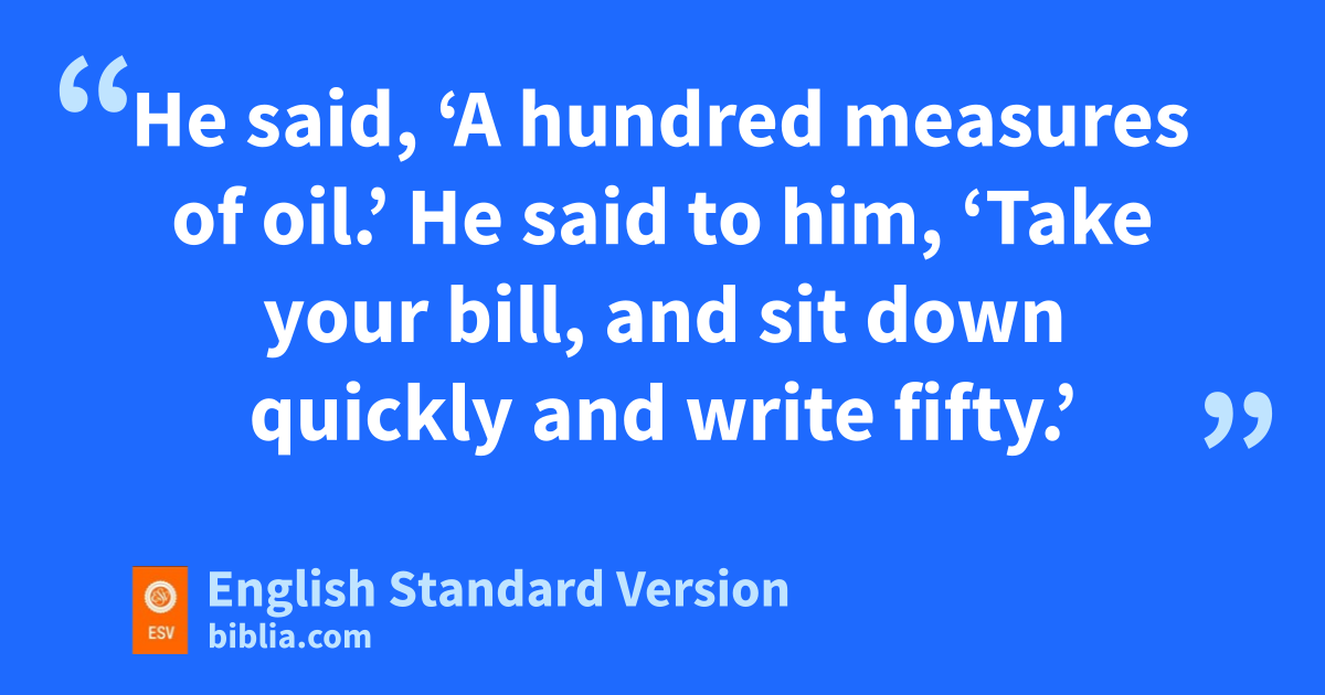 16 He also said to the disciples, “There was a rich man who had ja manager, and charges were brought to him that this man was wasting his possessions. 2 And he called him and said to him, ‘What is this that I hear about you? Turn in the account of your kmanagement, for you can no longer be manager.’ 3 And the manager said to himself, ‘What shall I do, since my master is taking the management away from me? I am not strong enough to dig, and I am ashamed to beg. 4 I have decided what to do, so that when I am removed from management, people may receive me into their houses.’ 5 So, summoning his master’s debtors one by one, he said to the first, ‘How much do you owe my master?’ 6 He said, ‘A hundred measures1 of oil.’ He said to him, ‘Take your bill, and sit down quickly and write fifty.’ 7 Then he said to another, ‘And how much do you owe?’ He said, ‘A hundred measures2 of wheat.’ He said to him, ‘Take your bill, and write eighty.’ 8 The master commended the dishonest manager for his lshrewdness. For mthe sons of this world3 are lmore shrewd in dealing with their own generation than nthe sons of light. 9 And I tell you, omake friends for yourselves by means of punrighteous wealth,4 so that when it fails they may receive you into the eternal dwellings.