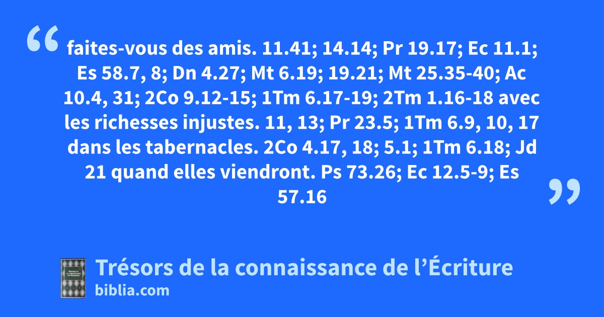 faites-vous des amis. 11.41; 14.14; Pr 19.17; Ec 11.1; Es 58.7, 8; Dn 4.27; Mt 6.19; 19.21; Mt 25.35-40; Ac 10.4, 31; 2Co 9.12-15; 1Tm 6.17-19; 2Tm 1.16-18 avec les richesses injustes. 11, 13; Pr 23.5; 1Tm 6.9, 10, 17 dans les tabernacles. 2Co 4.17, 18; 5.1; 1Tm 6.18; Jd 21 quand elles viendront. Ps 73.26; Ec 12.5-9; Es 57.16