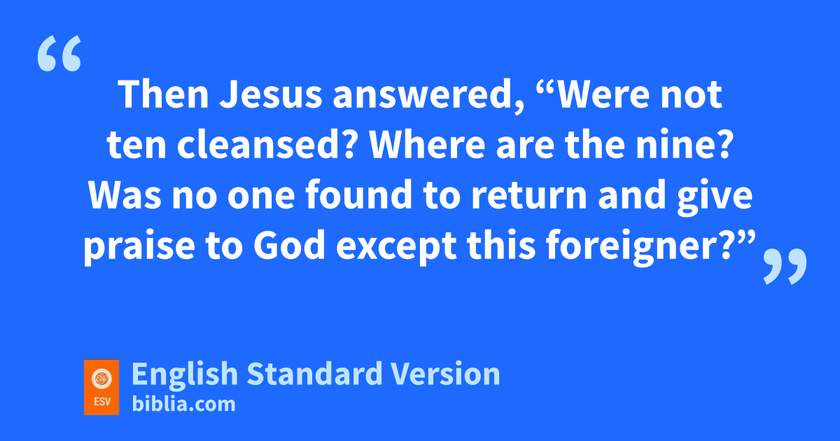 11 jOn the way to Jerusalem khe was passing along between Samaria and Galilee. 12 And as he entered a village, he was met by ten lepers,6 lwho stood at a distance 13 and lifted up their voices, saying, “Jesus, Master, have mercy on us.” 14 When he saw them he said to them, “Go and mshow yourselves to the priests.” And as they went they were cleansed. 15 Then one of them, when he saw that he was healed, turned back, npraising God with a loud voice; 16 and ohe fell on his face at Jesus’ feet, giving him thanks. Now he was pa Samaritan. 17 Then Jesus answered, “Were not qten cleansed? Where are the nine? 18 Was no one found to return and rgive praise to God except this sforeigner?” 19 And he said to him, “Rise and go your way; tyour faith has tmade you well.”7