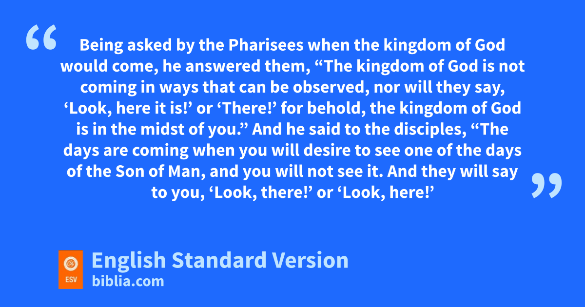 20 Being asked by the Pharisees uwhen the kingdom of God would come, he answered them, “The kingdom of God vis not coming in ways that can be observed, 21 nor wwill they say, ‘Look, here it is!’ or ‘There!’ for behold, the kingdom of God is in the midst of you.”8