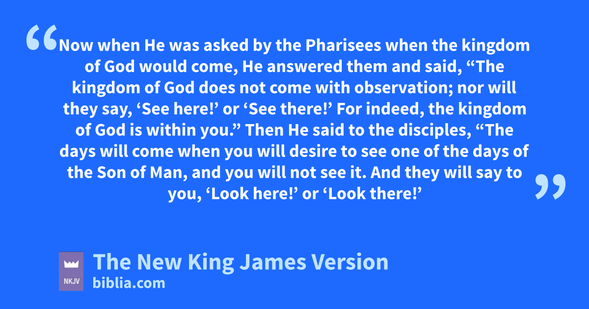 20 Now when He was asked by the Pharisees when the kingdom of God would come, He answered them and said, “The kingdom of God does not come with observation; 21 nnor will they say, 6‘See here!’ or ‘See there!’ For indeed, othe kingdom of God is 7within you.”
