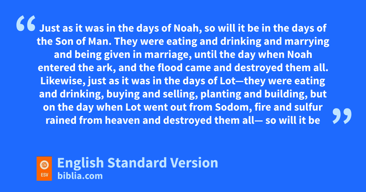 22 And he said to the disciples, x“The days are coming when you will desire yto see one of the days of the Son of Man, and you will not see it. 23 zAnd they will say to you, ‘Look, there!’ or ‘Look, here!’ Do not go out or follow them. 24 aFor as the lightning flashes and lights up the sky from one side to the other, so will the Son of Man be bin his day.9 25 But first che must suffer many things and cbe rejected by this generation. 26 dJust as it was in the days of eNoah, so will it be in the days of the Son of Man. 27 fThey were eating and drinking and marrying and being given in marriage, until the day when Noah entered the ark, and the flood came and destroyed them all. 28 Likewise, just as it was in the days of gLot—they were eating and drinking, buying and selling, planting and building, 29 hbut on the day when Lot went out from Sodom, fire and sulfur rained from heaven and destroyed them all— 30 so will it be ion the day when the Son of Man is revealed. 31 On that day, jlet the one who is on kthe housetop, with his goods in the house, not come down to take them away, and likewise let the one who is in the field not turn back. 32 lRemember Lot’s wife. 33 mWhoever seeks to preserve his life will lose it, but whoever loses his life will nkeep it. 34 I tell you, in that night there will be two in one bed. One will be taken and the other left. 35 oThere will be two women pgrinding together. One will be taken and the other left.”10 37 And they said to him, “Where, Lord?” He said to them, q“Where the corpse11 is, there the vultures12 will gather.”