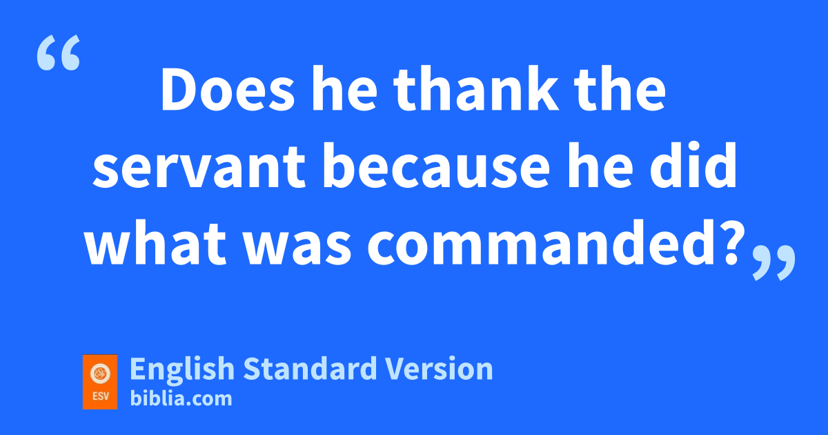 7 “Will any one of you who has a servant3 plowing or keeping sheep say to him when he has come in from the field, ‘Come at once and recline at table’? 8 Will he not rather say to him, ‘Prepare supper for me, and hdress properly,4 and serve me while I eat and drink, and afterward you will eat and drink’? 9 Does he thank the servant because he did what was commanded? 10 So you also, when you have done all that you were commanded, say, ‘We are iunworthy servants;5 we have only done what was our duty.’ ”