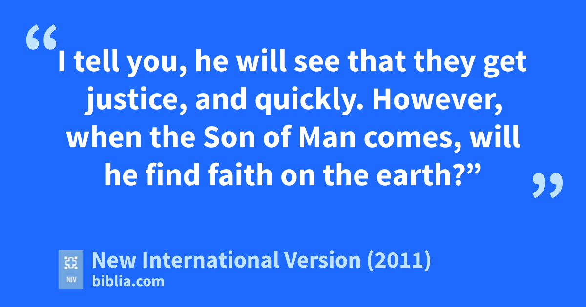6 And the Lordi said, “Listen to what the unjust judge says. 7 And will not God bring about justice for his chosen ones, who cry outj to him day and night? Will he keep putting them off? 8 I tell you, he will see that they get justice, and quickly. However, when the Son of Mank comes,l will he find faith on the earth?”