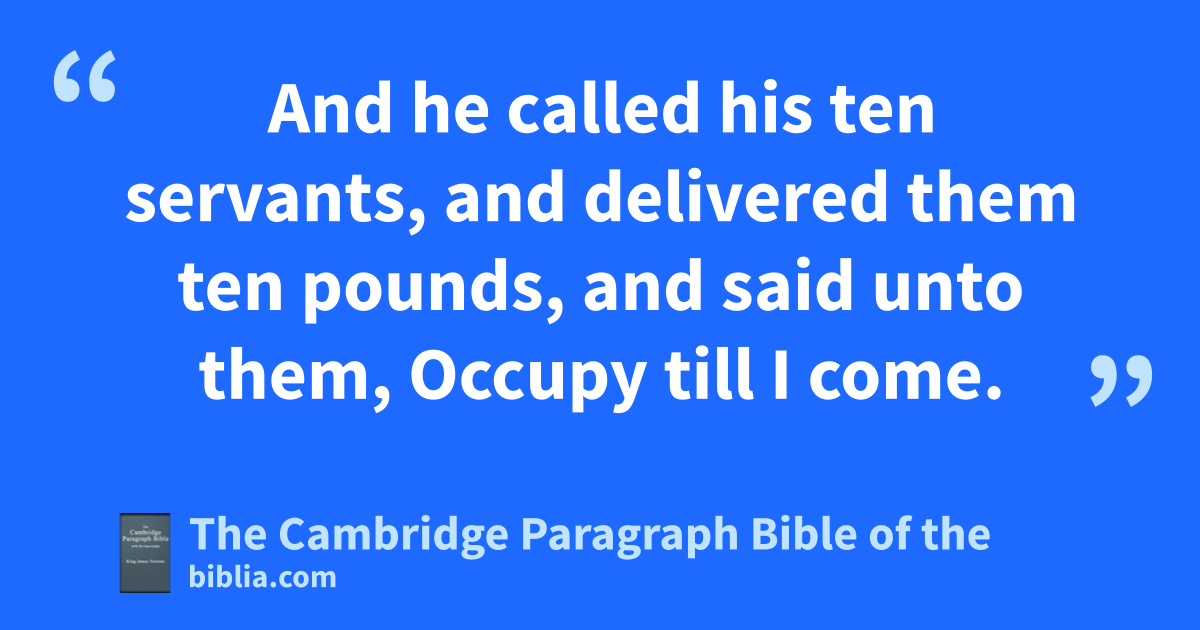 11 And as they heard these things, he radded and spake a parable, because he was nigh to Jerusalem, and because sthey thought that the kingdom of God should immediately appear. 12 He said therefore, tA certain unobleman wwent into a far country to receive for himself a kingdom, and to return. 13 And he called his xten servants, and delivered them ten * pounds, and said unto them, Occupy till I come. 14 But yhis citizens hated him, and sent a message after him, saying, We will not have this man to reign over us. 15 And it came to pass, that when he was returned, having received the kingdom, then he commanded these servants to be called unto him, to whom he had given the * money, that he might know how much every man had gained by trading. 16 Then came the first, saying, Lord, thy pound hath gained ten pounds. 17 And he said unto him, Well, thou good servant: because thou hast been zfaithful in aa very little, have thou authority over ten cities. 18 And the second came, saying, Lord, thy pound hath gained five pounds. 19 And he said likewise to him, Be thou also over five cities. 20 And another came, saying, Lord, behold, here is thy pound, which I have kept laid up in a bnapkin: 21 cfor I feared thee, because thou art an daustere man: thou takest up that thou layedst not down, and reapest that thou didst not sow. 22 And he saith unto him, eOut of thine own mouth will I judge thee, thou wicked servant. fThou knewest that I was an daustere man, taking up that I laid not down, and reaping that I did not sow: 23 wherefore then gavest not thou my money into gthe bank, that at my coming I might have hrequired imine own with usury? 24 And he said unto them that stood by, Take from him the pound, and give it to him that hath ten pounds. 25 (And they said unto him, Lord, he hath ten pounds.) 26 For I say unto you, kThat unto every one which hath shall be given; and from him that hath not, even that he hath shall be taken away from him. 27 But those mine enemies, lwhich would not that I should reign over them, bring hither, and mslay them before me.