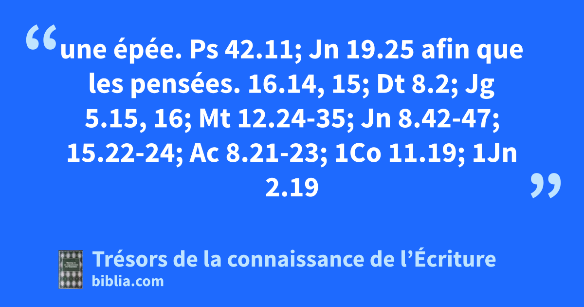 une épée. Ps 42.11; Jn 19.25 afin que les pensées. 16.14, 15; Dt 8.2; Jg 5.15, 16; Mt 12.24-35; Jn 8.42-47; 15.22-24; Ac 8.21-23; 1Co 11.19; 1Jn 2.19