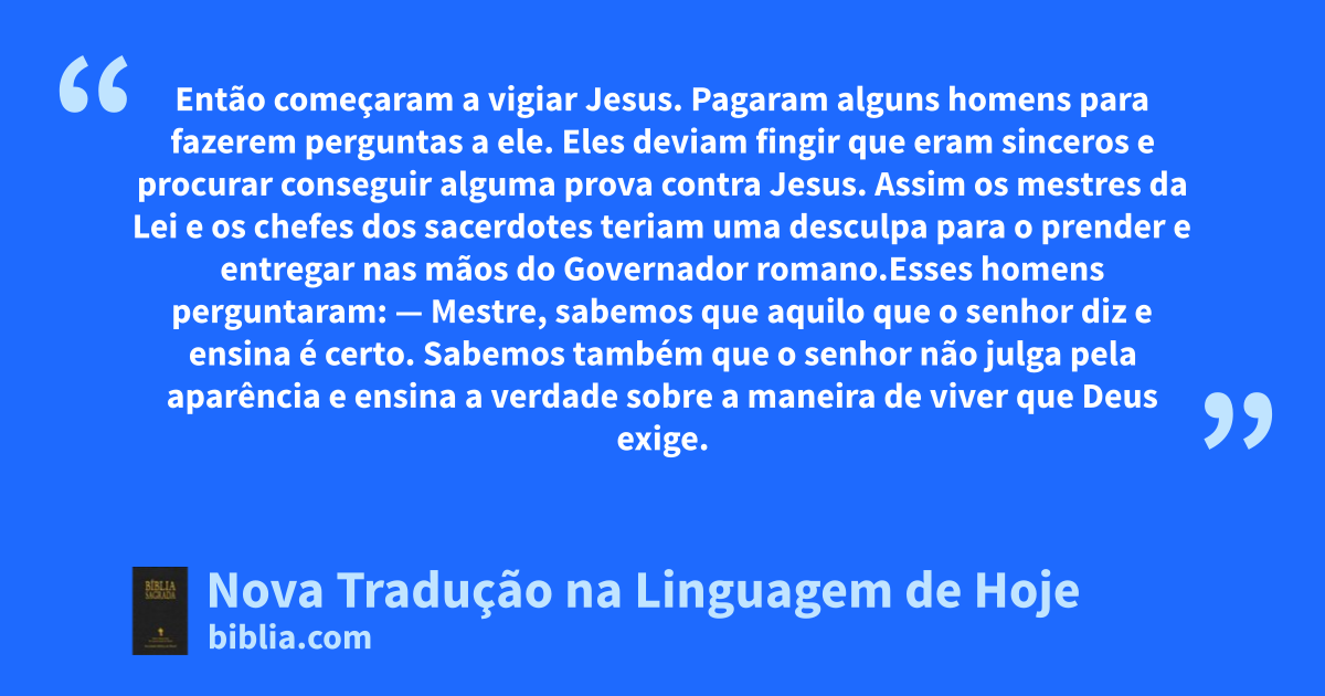 19 Os * mestres da Lei e os chefes dos sacerdotes sabiam que era contra eles que Jesus havia contado essa * parábola e queriam prendê-lo ali mesmo, porém tinham medo do povo.20 Então começaram a vigiar Jesus. Pagaram alguns homens para fazerem perguntas a ele. Eles deviam fingir que eram sinceros e procurar conseguir alguma prova contra Jesus. Assim os mestres da Lei e os chefes dos sacerdotes teriam uma desculpa para o prender e entregar nas mãos do Governador romano.21 Esses homens perguntaram: