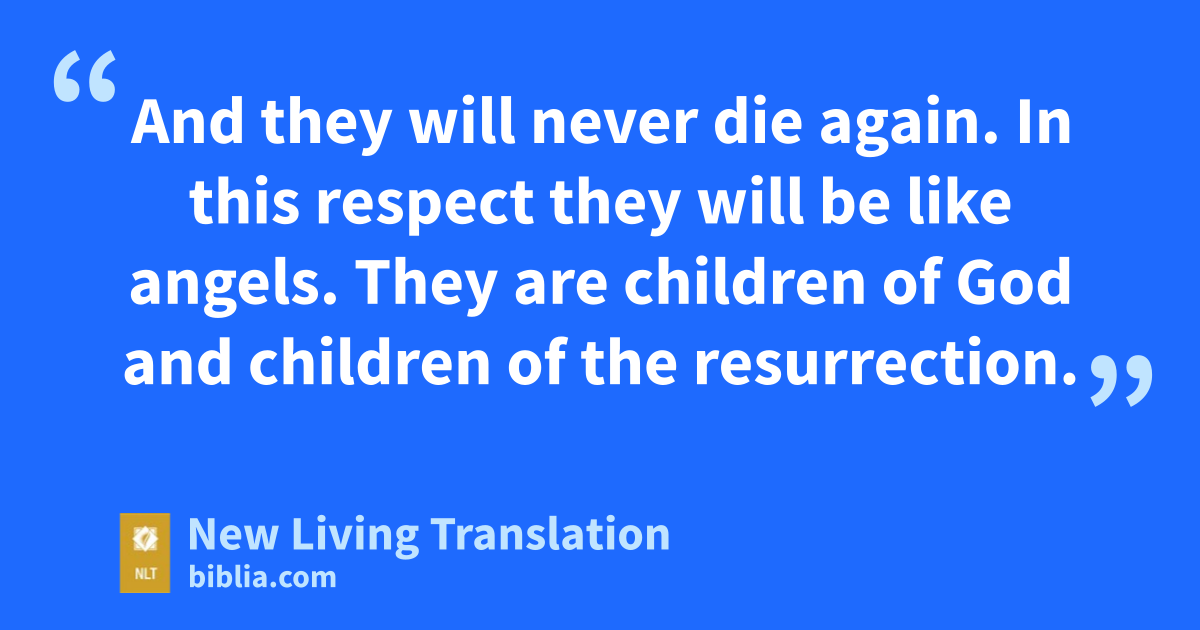 34 Jesus replied, “Marriage is for people here on earth. 35 But in the age to come, those worthy of being raised from the dead will neither marry nor be given in marriage. 36 And they will never die again. In this respect they will be like angels. They are children of God and children of the resurrection.
