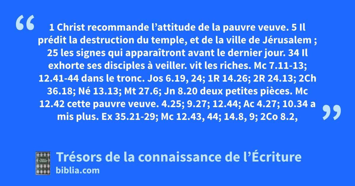 1 Christ recommande l’attitude de la pauvre veuve. 5 Il prédit la destruction du temple, et de la ville de Jérusalem ; 25 les signes qui apparaîtront avant le dernier jour. 34 Il exhorte ses disciples à veiller.