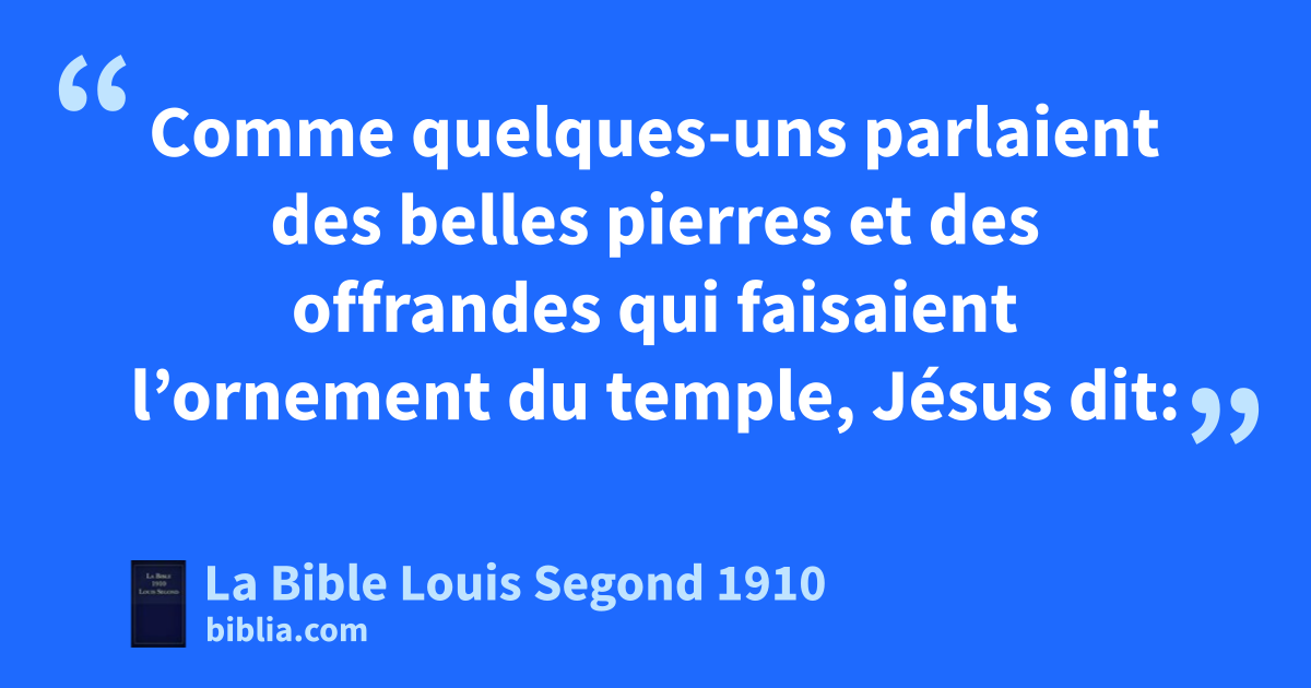 5cComme quelques-uns parlaient des belles pierres et des offrandes qui faisaient l’ornement du temple, Jésus dit: