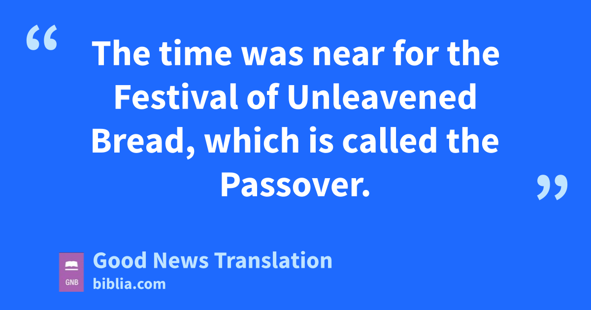 22 * The time was near for the Festival of Unleavened Bread, which is called the Passover. 2The chief priests and the teachers of the Law were afraid of the people, and so they were trying to find a way of putting Jesus to death secretly.