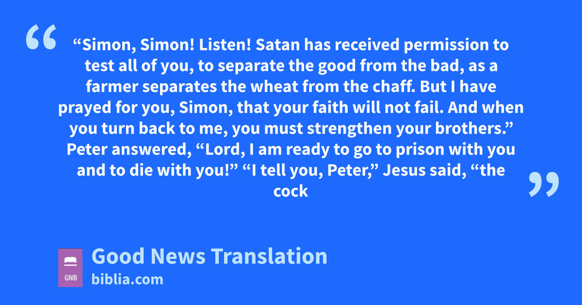 31 “Simon, Simon! Listen! Satan has received permission to test all of you, to separate the good from the bad, as a farmer separates the wheat from the chaff. 32But I have prayed for you, Simon, that your faith will not fail. And when you turn back to me, you must strengthen your brothers.”