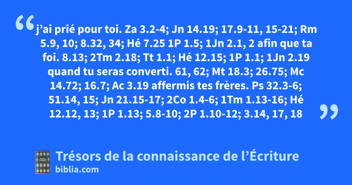 j’ai prié pour toi. Za 3.2-4; Jn 14.19; 17.9-11, 15-21; Rm 5.9, 10; 8.32, 34; Hé 7.25 1P 1.5; 1Jn 2.1, 2 afin que ta foi. 8.13; 2Tm 2.18; Tt 1.1; Hé 12.15; 1P 1.1; 1Jn 2.19 quand tu seras converti. 61, 62; Mt 18.3; 26.75; Mc 14.72; 16.7; Ac 3.19 affermis tes frères. Ps 32.3-6; 51.14, 15; Jn 21.15-17; 2Co 1.4-6; 1Tm 1.13-16; Hé 12.12, 13; 1P 1.13; 5.8-10; 2P 1.10-12; 3.14, 17, 18