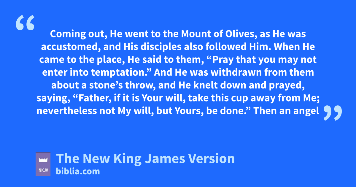 41 nAnd He was withdrawn from them about a stone’s throw, and He knelt down and prayed, 42 saying, “Father, if it is Your will, take this cup away from Me; nevertheless onot My will, but Yours, be done.” 43 6Then pan angel appeared to Him from heaven, strengthening Him. 44 qAnd being in agony, He prayed more earnestly. Then His sweat became like great drops of blood falling down to the ground.