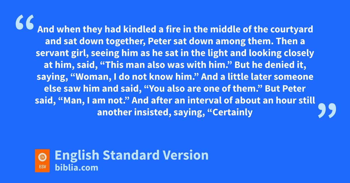 54 iThen they seized him and led him away, bringing him into the high priest’s house, jand Peter was following at a distance. 55 kAnd when they had kindled a fire in the middle of lthe courtyard and sat down together, Peter sat down among them. 56 Then a servant girl, seeing him as he sat in the light and looking closely at him, said, “This man also was with him.” 57 But he denied it, saying, “Woman, I do not know him.” 58 And a little later someone else saw him and said, “You also are one of them.” But Peter said, “Man, I am not.” 59 And after an interval of about an hour still another minsisted, saying, “Certainly this man also was with him, for he too is a Galilean.” 60 But Peter said, “Man, I do not know what you are talking about.” And immediately, while he was still speaking, the rooster crowed. 61 And the Lord turned and nlooked at Peter. And Peter remembered the saying of the Lord, how he had said to him, o“Before the rooster crows today, you will pdeny me three times.” 62 And he went out and wept bitterly.