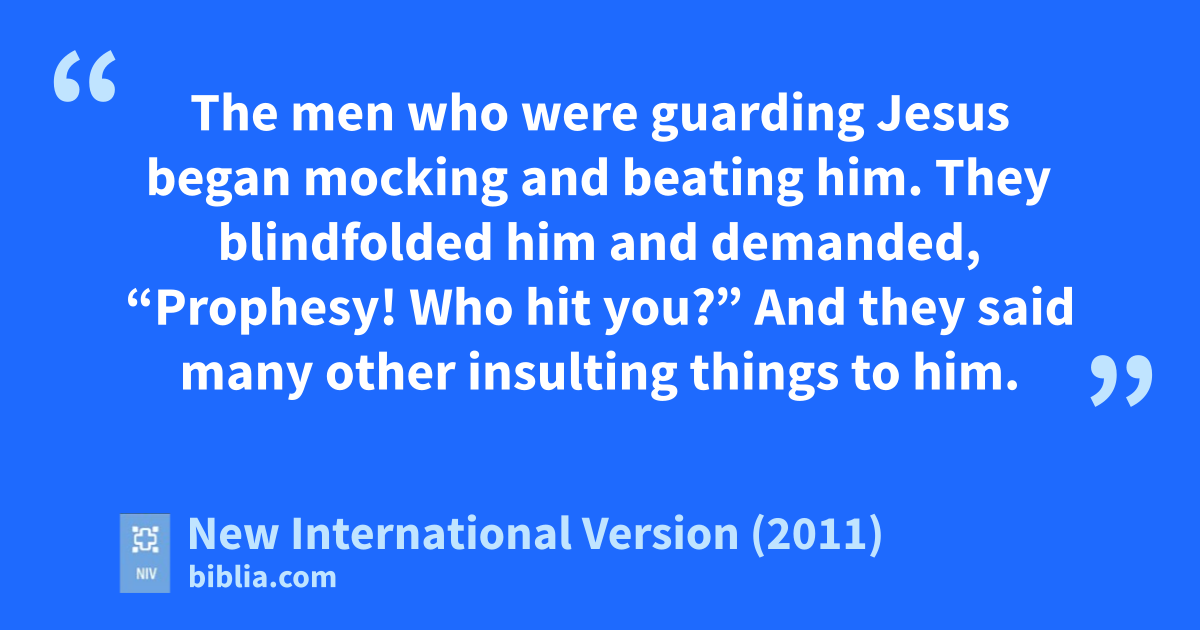 63 The men who were guarding Jesus began mocking and beating him. 64 They blindfolded him and demanded, “Prophesy! Who hit you?” 65 And they said many other insulting things to him.n