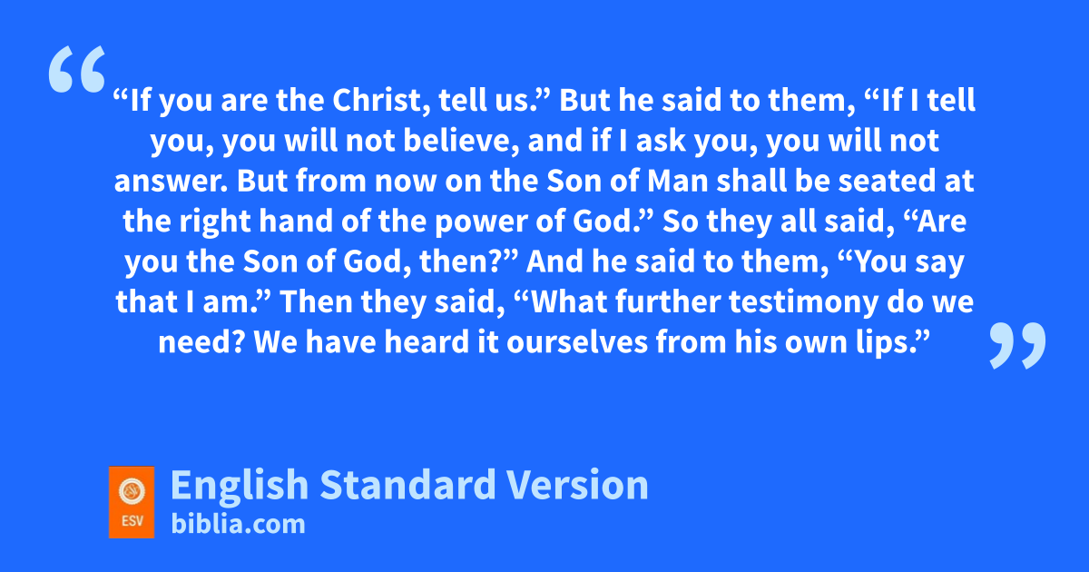 66 tWhen day came, uthe assembly of the elders of the people gathered together, both chief priests and scribes. And they led him away to their vcouncil, and they wsaid, 67 x“If you are ythe Christ, tell us.” But he said to them, “If I tell you, you will not believe, 68 and if I ask you, you will not answer. 69 But from now on the Son of Man shall be seated zat the right hand of the power of God.” 70 So they all said, “Are you athe Son of God, then?” And he said to them, b“You say that I am.” 71 Then they said, “What further testimony do we need? We have heard it ourselves from his own lips.”