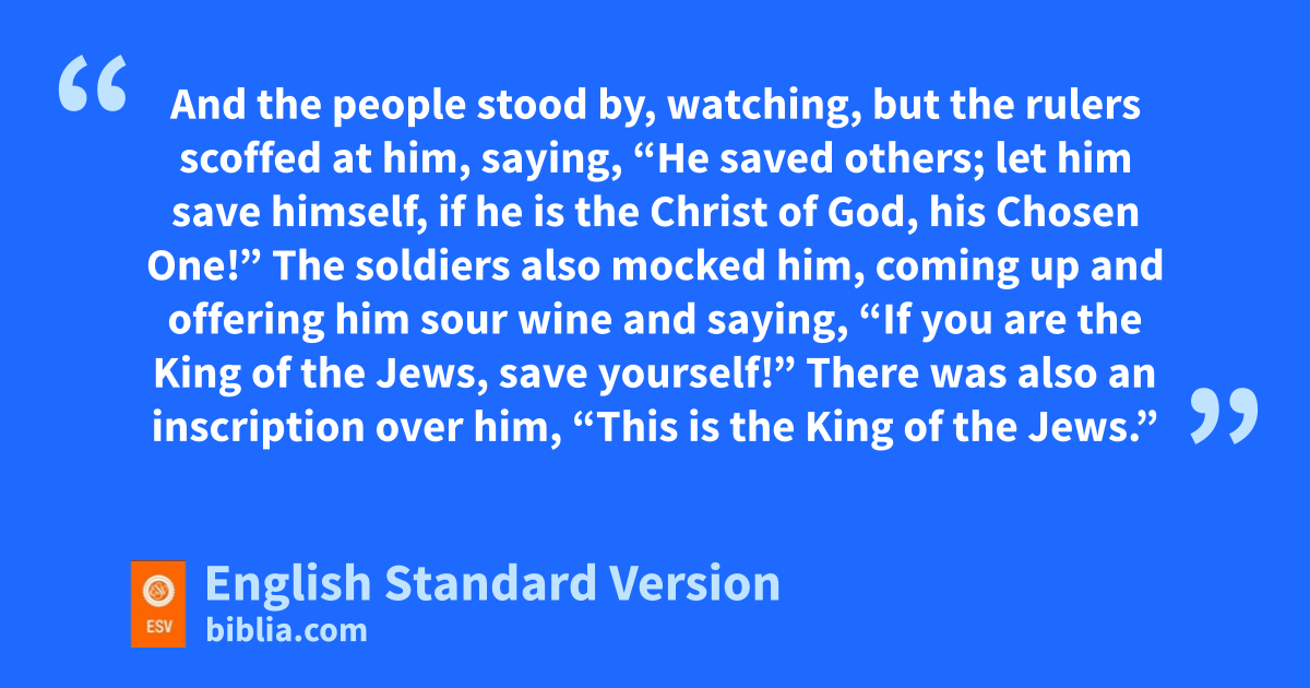 32 pTwo others, who were criminals, were led away to be put to death with him. 33 qAnd when they came to the place that is called The Skull, there they crucified him, and the criminals, pone on his right and one on his left. 34 And Jesus said, “Father, rforgive them, sfor they know not what they do.”2 And they cast lots tto divide his garments. 35 And uthe people stood by, watching, vbut wthe rulers xscoffed at him, saying, y“He saved others; zlet him save himself, aif he is bthe Christ of God, chis Chosen One!” 36 The soldiers also mocked him, coming up and doffering him sour wine 37 and saying, e“If you are fthe King of the Jews, save yourself!” 38 gThere was also an inscription over him,3 “This is fthe King of the Jews.”