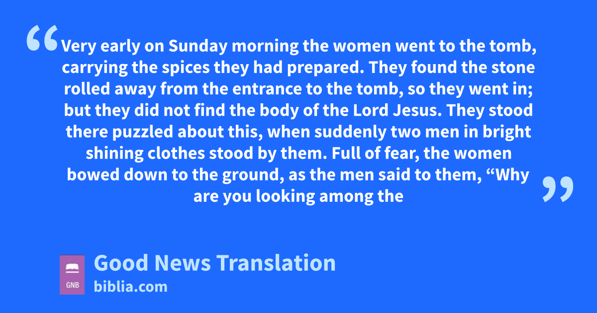 24 Very early on Sunday morning the women went to the tomb, carrying the spices they had prepared. 2They found the stone rolled away from the entrance to the tomb, 3so they went in; but they did not find the body of the Lord Jesus. 4They stood there puzzled about this, when suddenly two men in bright shining clothes stood by them. 5Full of fear, the women bowed down to the ground, as the men said to them, “Why are you looking among the dead for one who is alive? 6*He is not here; he has been raised. Remember what he said to you while he was in Galilee: 7*‘The Son of Man must be handed over to sinners, be crucified, and three days later rise to life.’ ”