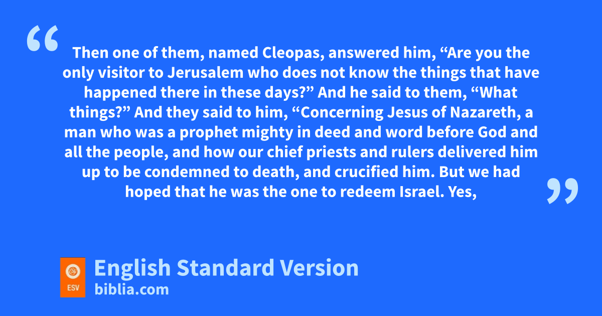 13 That very day ytwo of them were going to a village named Emmaus, about seven miles1 from Jerusalem, 14 and they were talking with each other about all these things that had happened. 15 While they were talking and discussing together, Jesus himself drew near and went with them. 16 zBut their eyes were kept from recognizing him. 17 And he said to them, “What is this conversation that you are holding with each other as you walk?” And they stood still, looking sad. 18 Then one of them, named Cleopas, answered him, “Are you the only visitor to Jerusalem who does not know the things that have happened there in these days?” 19 And he said to them, “What things?” And they said to him, “Concerning Jesus of Nazareth, a man who was aa prophet bmighty in deed and word before God and all the people, 20 and chow our chief priests and drulers delivered him up to be condemned to death, and crucified him. 21 But we had hoped that he was ethe one to redeem Israel. Yes, and besides all this, it is now fthe third day since these things happened. 22 Moreover, some women of our company amazed us. gThey were at the tomb early in the morning, 23 and hwhen they did not find his body, they came back saying that ithey had even seen a vision of angels, who said that he was alive. 24 jSome of those who were with us went to the tomb and found it just as the women had said, but him they did not see.” 25 And he said to them, “O foolish ones, and slow of heart to believe all that the prophets have spoken! 26 kWas it not necessary that lthe Christ should suffer these things and enter into mhis glory?” 27 And nbeginning with oMoses and pall the Prophets, he interpreted to them in all the Scriptures the things concerning himself.