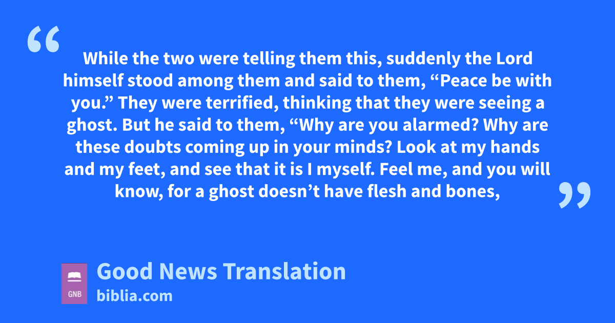 37 They were terrified, thinking that they were seeing a ghost. 38But he said to them, “Why are you alarmed? Why are these doubts coming up in your minds? 39Look at my hands and my feet, and see that it is I myself. Feel me, and you will know, for a ghost doesn’t have flesh and bones, as you can see I have.”