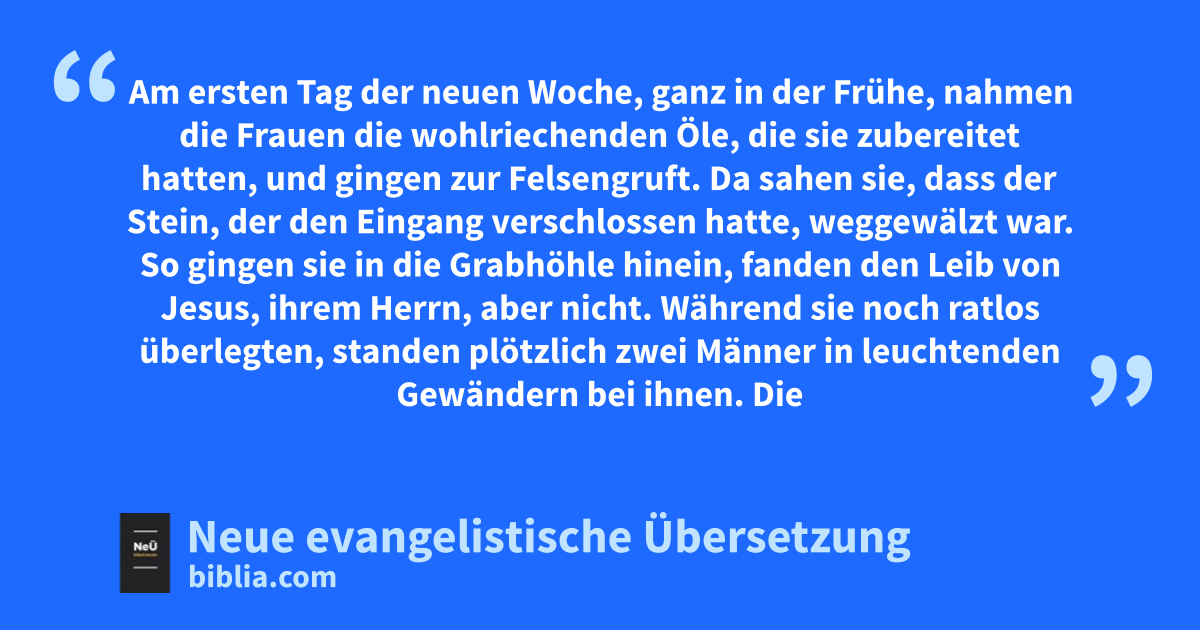 24 1 Am ersten Tag der neuen Woche, ganz in der Frühe, nahmen die Frauen die wohlriechenden Öle, die sie zubereitet hatten, und gingen zur Felsengruft. 2 Da sahen sie, dass der Stein, der den Eingang verschlossen hatte, weggewälzt war. 3 So gingen sie in die Grabhöhle hinein, fanden den Leib von Jesus, ihrem Herrn, aber nicht. 4 Während sie noch ratlos überlegten, standen plötzlich zwei Männer in leuchtenden Gewändern bei ihnen. 5 Die Frauen erschraken und blickten zu Boden. Doch die beiden Männer sagten zu ihnen: „Was sucht ihr den Lebendigen bei den Toten? 6 Er ist nicht hier, er ist auferstanden. Erinnert ihr euch nicht an das, was er euch in Galiläa sagte, 7 dass der Menschensohn in die Hände sündiger Menschen ausgeliefert und gekreuzigt werden muss und dass er am dritten Tag auferstehen würde?“ 8 Da erinnerten sie sich an seine Worte. 9 Sie verließen die Felsengruft und berichteten alles den elf Aposteln und den anderen dort. 10 Es waren Maria aus Magdala, Johanna und Maria, die Mutter des Jakobus, und noch einige andere. Sie erzählten den Aposteln, was sie erlebt hatten. 11 Doch die hielten das für leeres Geschwätz und glaubten ihnen nicht. 12 Petrus allerdings sprang auf und lief zum Felsengrab. Er beugte sich vor, um hineinzuschauen, sah aber nur die Leinenbinden daliegen. Dann ging er wieder zurück und fragte sich verwundert, was da wohl geschehen war.