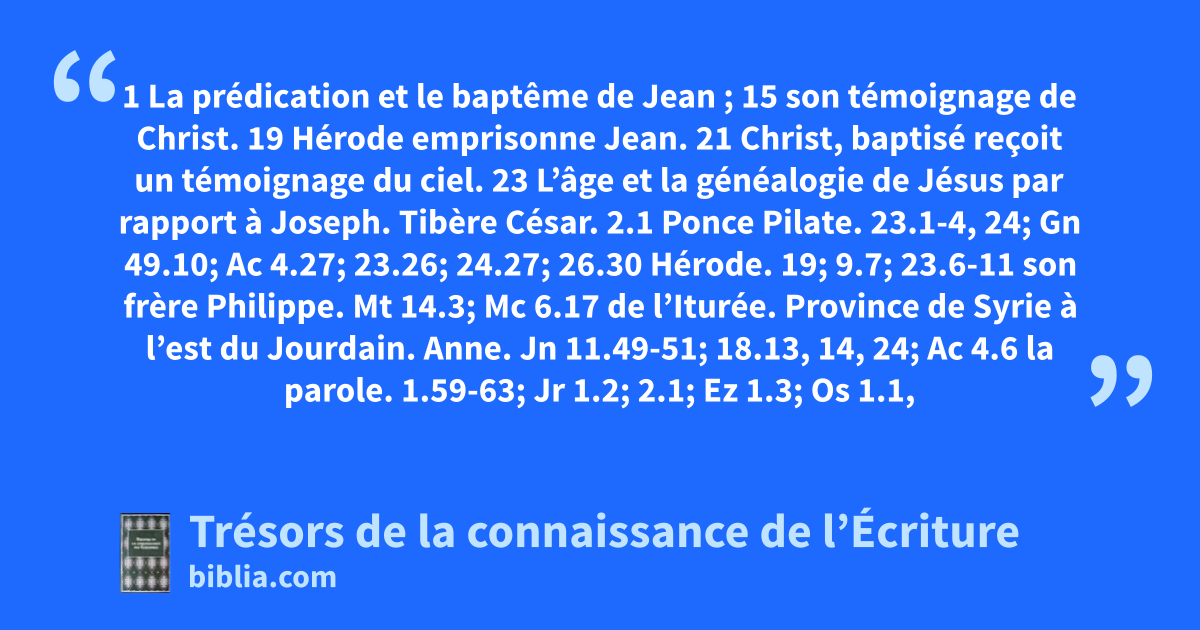 1 La prédication et le baptême de Jean ; 15 son témoignage de Christ. 19 Hérode emprisonne Jean. 21 Christ, baptisé reçoit un témoignage du ciel. 23 L’âge et la généalogie de Jésus par rapport à Joseph.