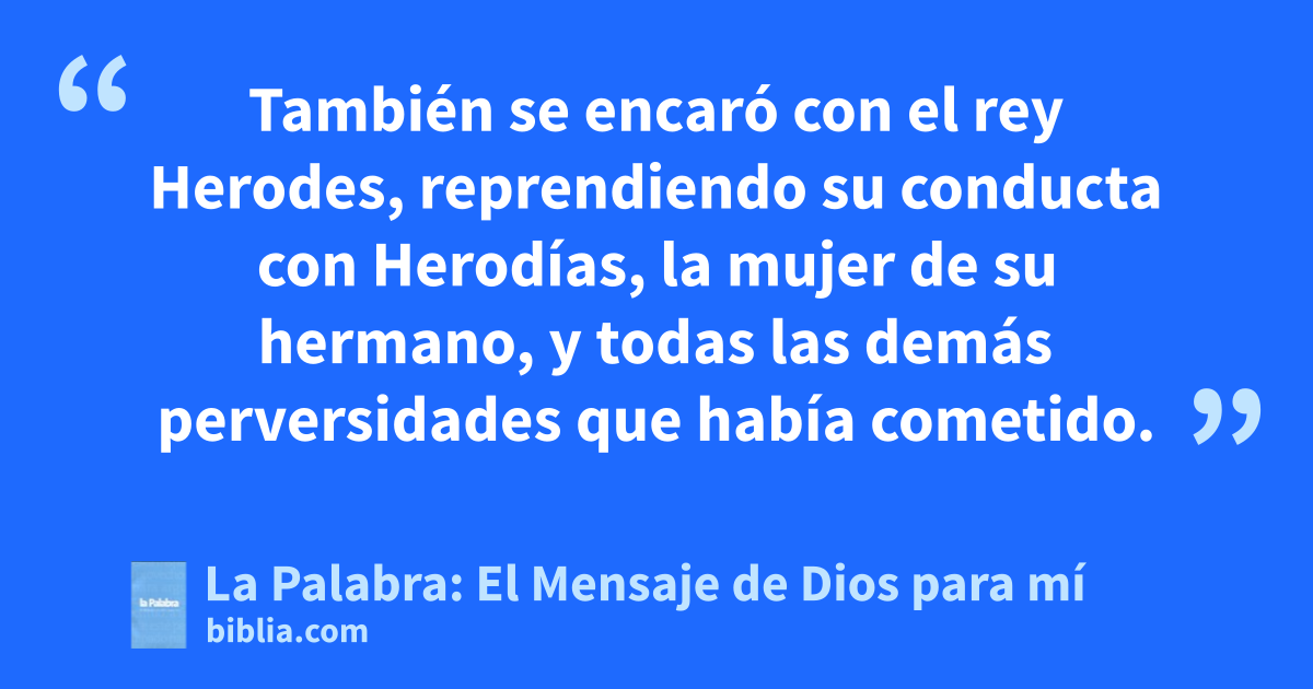 18 Con estos y otros muchos discursos exhortaba Juan a la gente y anunciaba al pueblo la buena noticia. 19 También se encaró con el rey Herodes, reprendiendo su conducta con Herodías, la mujer de su hermano, y todas las demás perversidades que había cometido. 20 Entonces Herodes metió a Juan en la cárcel, con lo que colmó la cuenta de sus crímenes.