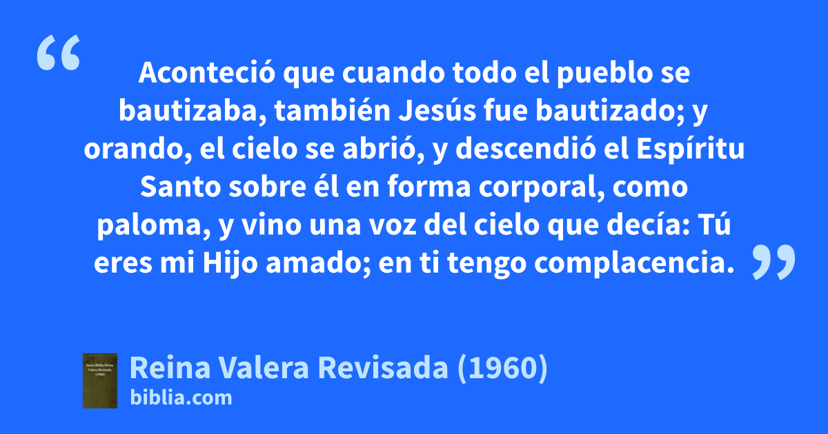 21Aconteció que cuando todo el pueblo se bautizaba, también Jesús fue bautizado; y orando, el cielo se abrió, 22y descendió el Espíritu Santo sobre él en forma corporal, como paloma, y vino una voz del cielo que decía: Tú eres mi Hijo amado; en ti tengo complacencia.g