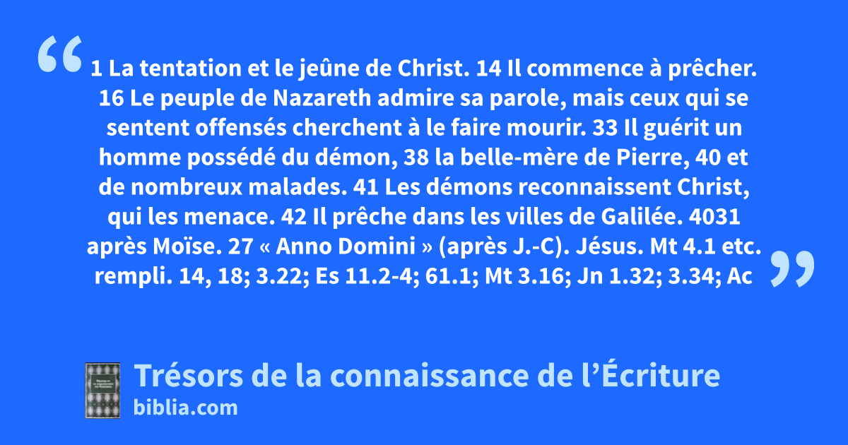 1 La tentation et le jeûne de Christ. 14 Il commence à prêcher. 16 Le peuple de Nazareth admire sa parole, mais ceux qui se sentent offensés cherchent à le faire mourir. 33 Il guérit un homme possédé du démon, 38 la belle-mère de Pierre, 40 et de nombreux malades. 41 Les démons reconnaissent Christ, qui les menace. 42 Il prêche dans les villes de Galilée.