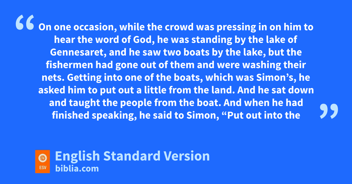 5 On one occasion, while the crowd was pressing in on him to hear the word of God, he was standing by uthe lake of Gennesaret, 2 vand he saw two boats by the lake, but the fishermen had gone out of them and were wwashing their nets. 3 Getting into one of the boats, which was Simon’s, he asked him to put out a little from the land. And xhe sat down and taught the people from the boat. 4 And when he had finished speaking, he said to Simon, y“Put out into the deep and let down your nets for a catch.” 5 And Simon answered, “Master, zwe toiled all night and took nothing! But at your word I will let down the nets.” 6 And when they had done this, athey enclosed a large number of fish, and atheir nets were breaking. 7 They signaled to their partners in the other boat to come and help them. bAnd they came and filled both the boats, so that they began to sink. 8 But when Simon Peter saw it, he fell down at Jesus’ knees, saying, c“Depart from me, for dI am a sinful man, O Lord.” 9 For he and all who were with him were astonished at the catch of fish that they had taken, 10 and so also were James and John, sons of Zebedee, who were partners with Simon. And Jesus said to Simon, “Do not be afraid; from now on you will be catching men.”1 11 And when they had brought their boats to land, ethey left everything and followed him.