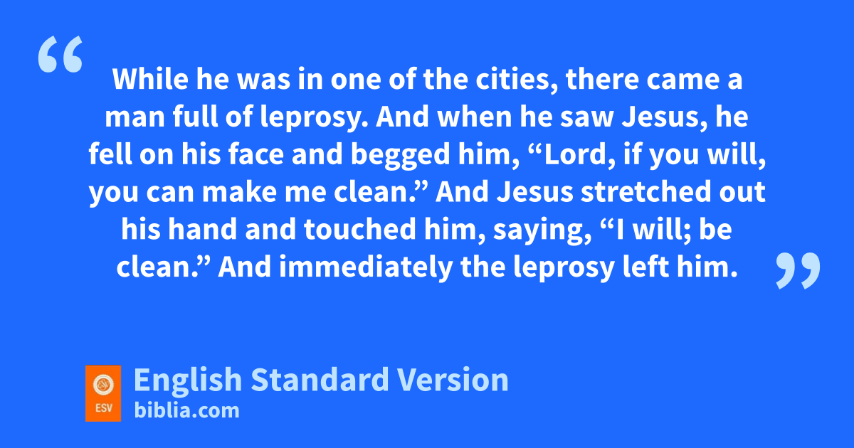 12 While he was in one of the cities, fthere came a man full of leprosy.2 And when he saw Jesus, he gfell on his face and begged him, “Lord, hif you will, you can make me clean.” 13 And Jesus3 stretched out his hand and touched him, saying, “I will; be clean.” And immediately the leprosy left him. 14 And he charged him ito tell no one, but “go and show jyourself to the priest, and kmake an offering for your cleansing, as Moses commanded, lfor a proof to them.” 15 mBut now even more the report about him went abroad, and great crowds gathered to hear him and to be healed of their infirmities. 16 But nhe would withdraw to desolate places and npray.