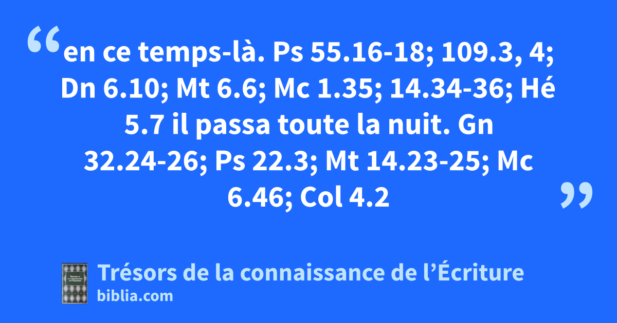 en ce temps-là. Ps 55.16-18; 109.3, 4; Dn 6.10; Mt 6.6; Mc 1.35; 14.34-36; Hé 5.7 il passa toute la nuit. Gn 32.24-26; Ps 22.3; Mt 14.23-25; Mc 6.46; Col 4.2
