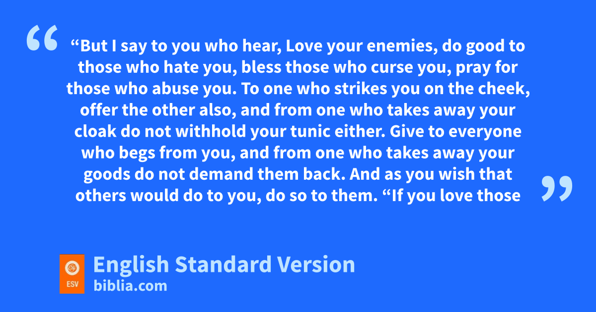 27 “But I say to you who hear, sLove your enemies, tdo good to those who hate you, 28 ubless those who curse you, spray for those who abuse you. 29 vTo one who wstrikes you on the cheek, offer the other also, and from one who takes away your cloak do not withhold your tunic2 either. 30 xGive to everyone who begs from you, and from one who takes away your goods do not demand them back. 31 And yas you wish that others would do to you, do so to them.