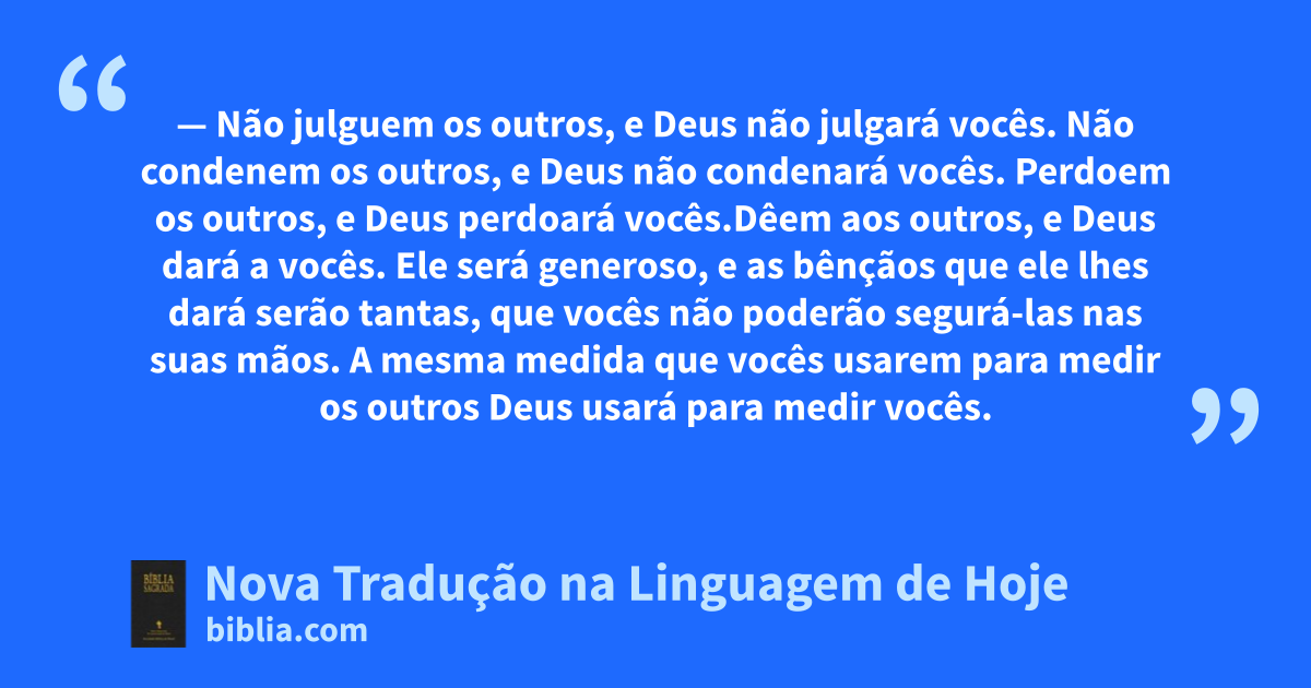 37 — Não julguem os outros, e Deus não julgará vocês. Não condenem os outros, e Deus não condenará vocês. Perdoem os outros, e Deus perdoará vocês. 38 Dêem aos outros, e Deus dará a vocês. Ele será generoso, e as bênçãos que ele lhes dará serão tantas, que vocês não poderão segurá-las nas suas mãos. A mesma medida que vocês usarem para medir os outros Deus usará para medir vocês.