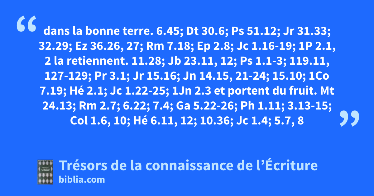 dans la bonne terre. 6.45; Dt 30.6; Ps 51.12; Jr 31.33; 32.29; Ez 36.26, 27; Rm 7.18; Ep 2.8; Jc 1.16-19; 1P 2.1, 2 la retiennent. 11.28; Jb 23.11, 12; Ps 1.1-3; 119.11, 127-129; Pr 3.1; Jr 15.16; Jn 14.15, 21-24; 15.10; 1Co 7.19; Hé 2.1; Jc 1.22-25; 1Jn 2.3 et portent du fruit. Mt 24.13; Rm 2.7; 6.22; 7.4; Ga 5.22-26; Ph 1.11; 3.13-15; Col 1.6, 10; Hé 6.11, 12; 10.36; Jc 1.4; 5.7, 8