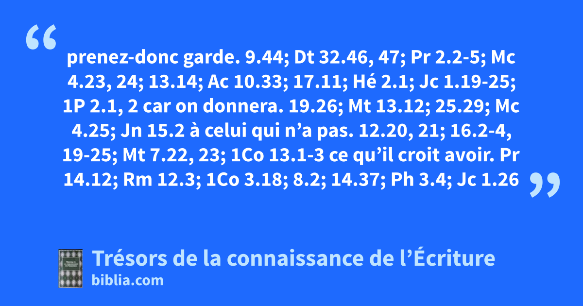 prenez-donc garde. 9.44; Dt 32.46, 47; Pr 2.2-5; Mc 4.23, 24; 13.14; Ac 10.33; 17.11; Hé 2.1; Jc 1.19-25; 1P 2.1, 2 car on donnera. 19.26; Mt 13.12; 25.29; Mc 4.25; Jn 15.2 à celui qui n’a pas. 12.20, 21; 16.2-4, 19-25; Mt 7.22, 23; 1Co 13.1-3 ce qu’il croit avoir. Pr 14.12; Rm 12.3; 1Co 3.18; 8.2; 14.37; Ph 3.4; Jc 1.26