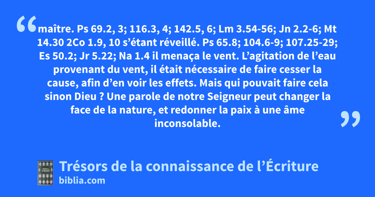 maître. Ps 69.2, 3; 116.3, 4; 142.5, 6; Lm 3.54-56; Jn 2.2-6; Mt 14.30 2Co 1.9, 10 s’étant réveillé. Ps 65.8; 104.6-9; 107.25-29; Es 50.2; Jr 5.22; Na 1.4 il menaça le vent. L’agitation de l’eau provenant du vent, il était nécessaire de faire cesser la cause, afin d’en voir les effets. Mais qui pouvait faire cela sinon Dieu ? Une parole de notre Seigneur peut changer la face de la nature, et redonner la paix à une âme inconsolable.