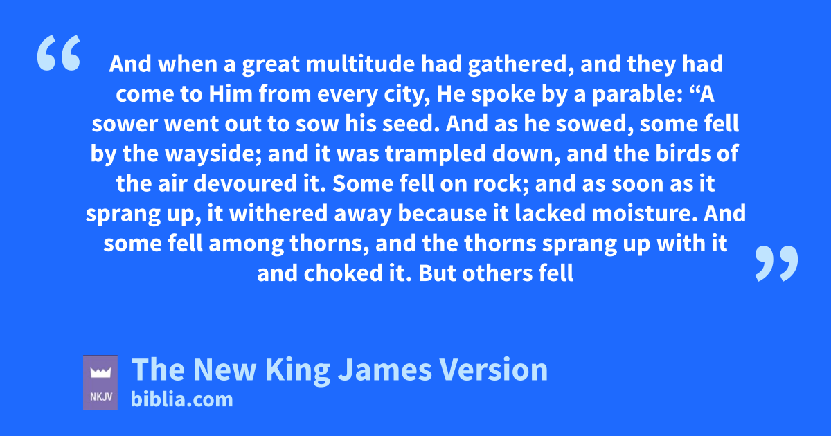 4 cAnd when a great multitude had gathered, and they had come to Him from every city, He spoke by a parable: 5 “A sower went out to sow his seed. And as he sowed, some fell by the wayside; and it was trampled down, and the birds of the air devoured it. 6 Some fell on rock; and as soon as it sprang up, it withered away because it lacked moisture. 7 And some fell among thorns, and the thorns sprang up with it and choked it. 8 But others fell on good ground, sprang up, and yielded 5a crop a hundredfold.” When He had said these things He cried, d“He who has ears to hear, let him hear!”