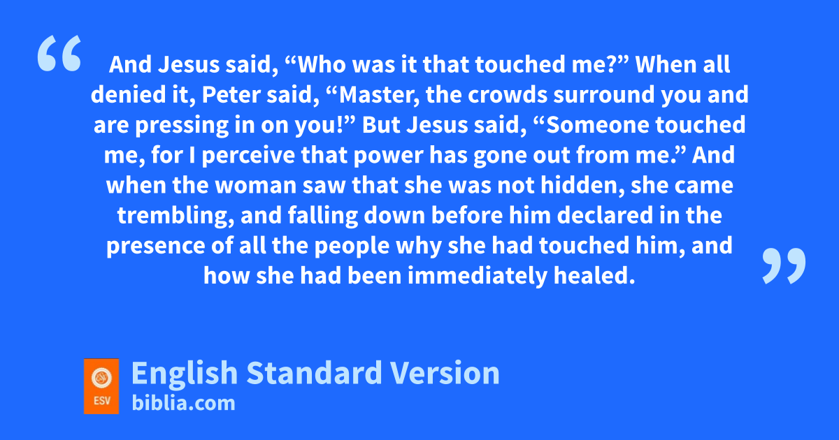 As Jesus went, the people spressed around him. 43 And there was a woman twho had had a discharge of blood for twelve years, and though she had spent all her uliving on physicians,6 she could not be healed by anyone. 44 She came up behind him and touched vthe fringe of his garment, and wimmediately her discharge of blood ceased. 45 And Jesus said, “Who was it that touched me?” When all denied it, Peter7 said, “Master, the crowds surround you and are pressing in on you!” 46 But Jesus said, “Someone touched me, for I perceive that xpower has gone out from me.” 47 And when the woman saw that she was not hidden, she came trembling, and falling down before him declared in the presence of all the people why she had touched him, and how she had been immediately healed. 48 And he said to her, “Daughter, yyour faith has made you well; ygo in peace.”