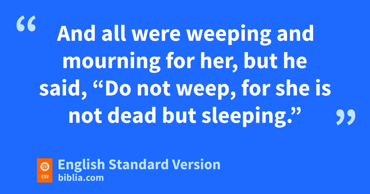 49 While he was still speaking, someone from zthe ruler’s house came and said, “Your daughter is dead; ado not trouble bthe Teacher any more.” 50 But Jesus on hearing this answered him, “Do not fear; only believe, and she will be well.” 51 And when he came to the house, he allowed no one to enter with him, except cPeter and dJohn and James, and the father and mother of the child. 52 And all were weeping and emourning for her, but he fsaid, “Do not weep, for gshe is not dead but hsleeping.” 53 And they laughed at him, knowing that she was dead. 54 But itaking her by the hand he called, saying, “Child, jarise.” 55 And kher spirit returned, and she got up at once. And he directed that something should be given her to eat. 56 And her parents were amazed, but lhe charged them to tell no one what had happened.