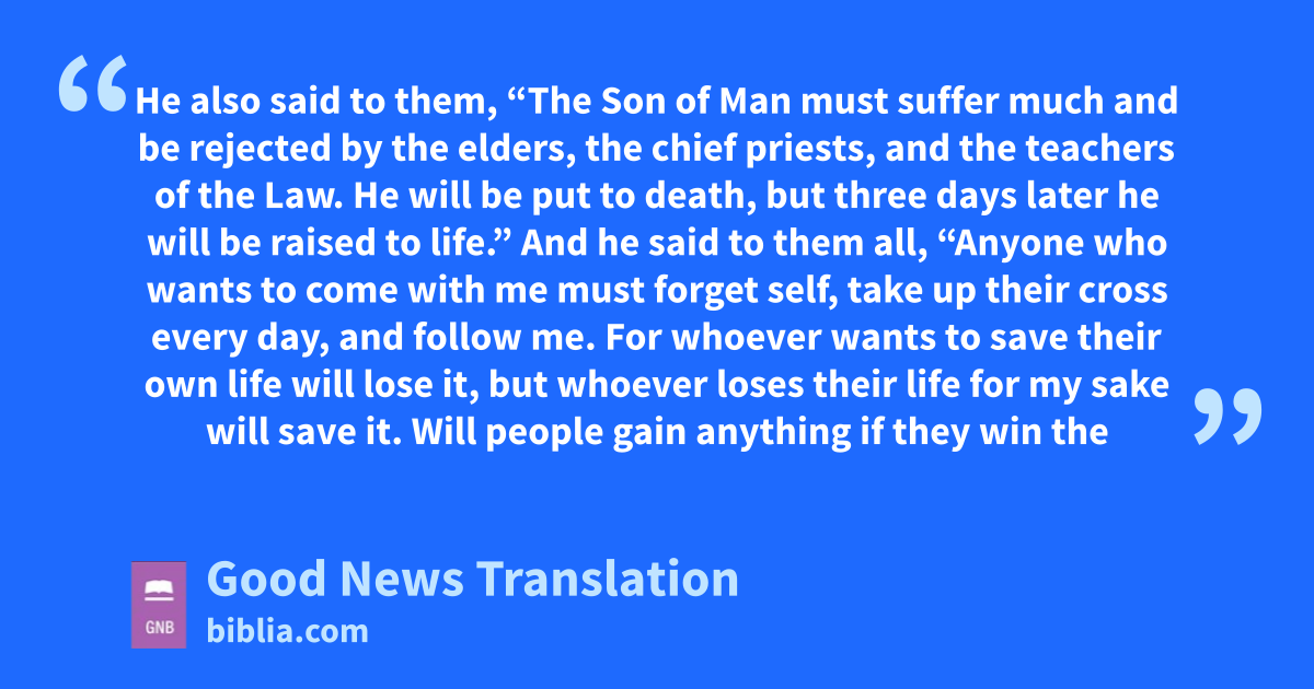 23 *And he said to them all, “Anyone who wants to come with me must forget self, take up their cross every day, and follow me. 24*For whoever wants to save their own life will lose it, but whoever loses their life for my sake will save it. 25Will people gain anything if they win the whole world but are themselves lost or defeated? Of course not! 26If people are ashamed of me and of my teaching, then the Son of Man will be ashamed of them when he comes in his glory and in the glory of the Father and of the holy angels. 27I assure you that there are some here who will not die until they have seen the Kingdom of God.”