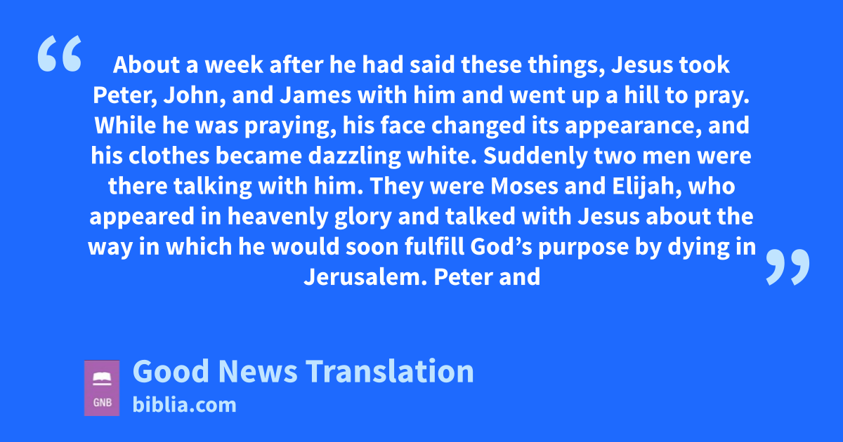 28 *About a week after he had said these things, Jesus took Peter, John, and James with him and went up a hill to pray. 29*While he was praying, his face changed its appearance, and his clothes became dazzling white. 30*Suddenly two men were there talking with him. They were Moses and Elijah, 31*who appeared in heavenly glory and talked with Jesus about the way in which he would soon fulfill God’s purpose by dying in Jerusalem. 32*Peter and his companions were sound asleep, but they woke up and saw Jesus’ glory and the two men who were standing with him. 33*As the men were leaving Jesus, Peter said to him, “Master, how good it is that we are here! We will make three tents, one for you, one for Moses, and one for Elijah.” (He did not really know what he was saying.)