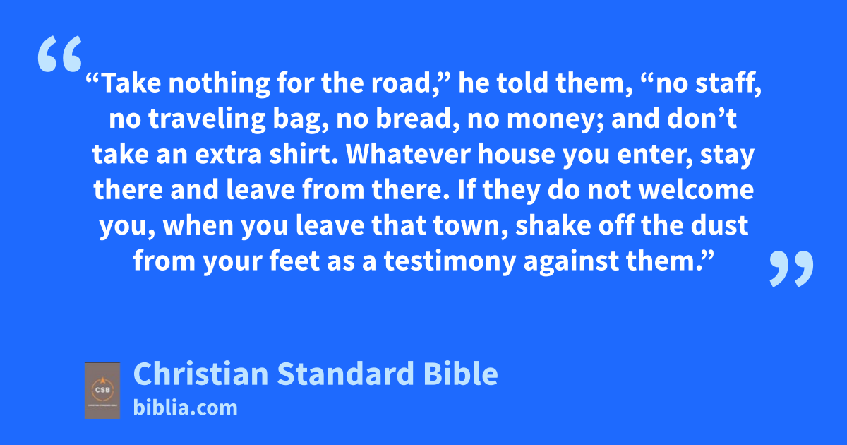 3 “Take nothing for the road,”z he told them, “no staff,aa no traveling bag, no bread, no money; and don’t take an extra shirt. 4 Whatever house you enter, stay there and leave from there. 5 If they do not welcome you, when you leave that town, shake off the dust from your feet as a testimony against them.”ab 6 So they went out and traveled from village to village, proclaiming the good news and healing everywhere.