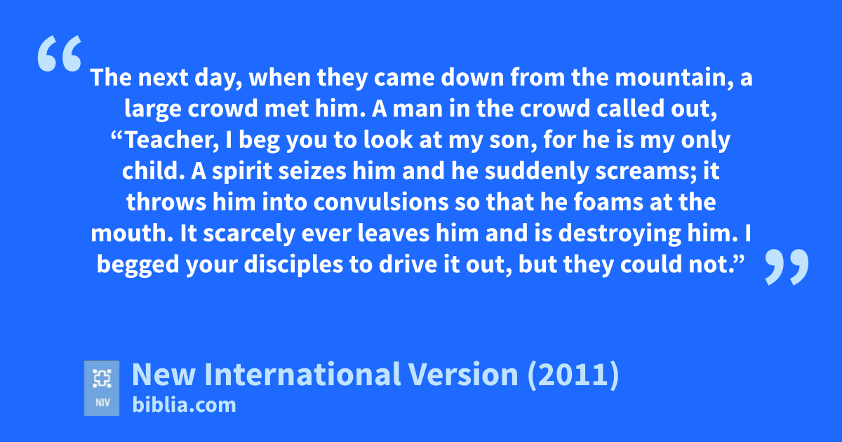 37 The next day, when they came down from the mountain, a large crowd met him. 38 A man in the crowd called out, “Teacher, I beg you to look at my son, for he is my only child. 39 A spirit seizes him and he suddenly screams; it throws him into convulsions so that he foams at the mouth. It scarcely ever leaves him and is destroying him. 40 I begged your disciples to drive it out, but they could not.”