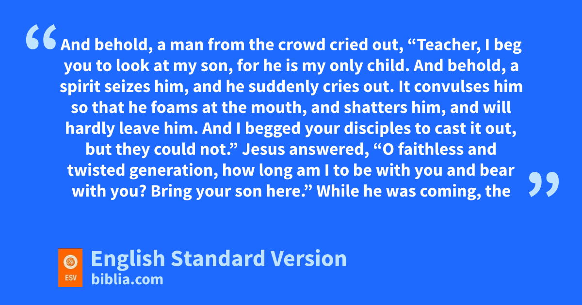 37 qOn the next day, when they had come down from the mountain, a great crowd met him. 38 And behold, a man from the crowd cried out, “Teacher, I beg you to look at my son, for rhe is my only child. 39 And behold, a spirit seizes him, and he suddenly cries out. It convulses him so that he foams at the mouth, and shatters him, and will hardly leave him. 40 And I begged your disciples to cast it out, but sthey could not.” 41 Jesus answered, “O tfaithless and twisted generation, uhow long am I to be with you and bear with you? Bring your son here.” 42 While he was coming, the demon threw him to the ground and convulsed him. But Jesus vrebuked the unclean spirit and healed the boy, and wgave him back to his father. 43 And all were astonished at xthe majesty of God.