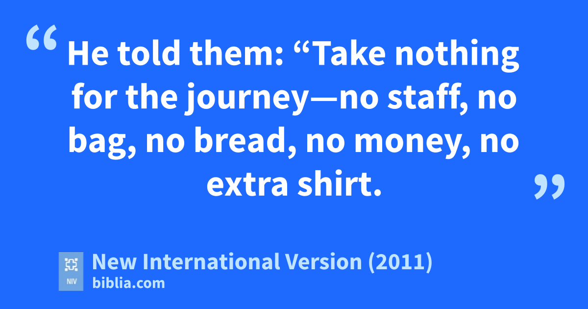9 When Jesus had called the Twelve together, he gave them power and authority to drive out all demonsk and to cure diseases,l 2 and he sent them out to proclaim the kingdom of Godm and to heal the sick. 3 He told them: “Take nothing for the journey—no staff, no bag, no bread, no money, no extra shirt.n 4 Whatever house you enter, stay there until you leave that town. 5 If people do not welcome you, leave their town and shake the dust off your feet as a testimony against them.”o 6 So they set out and went from village to village, proclaiming the good news and healing people everywhere.